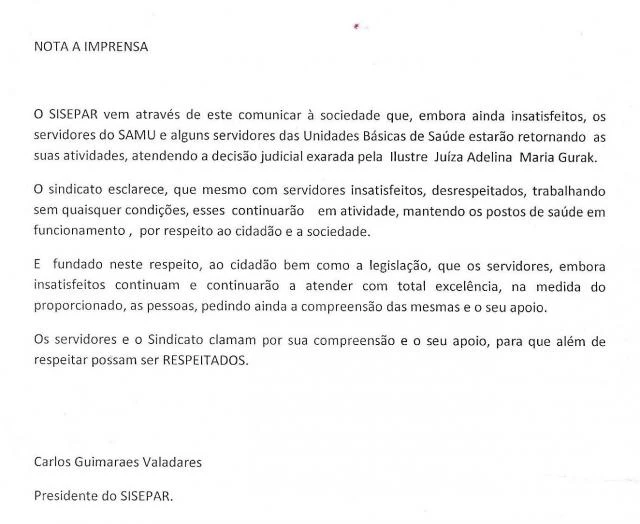 O SISEPAR vem através de este comunicar à sociedade que, embora ainda insatisfeitos, os servidores do SAMU e alguns servidores das Unidades Básicas de Saúde estarão retornando as suas atividades, atendendo a decisão judicial exarada pela Ilustre Juíza Adelina Maria Gurak.