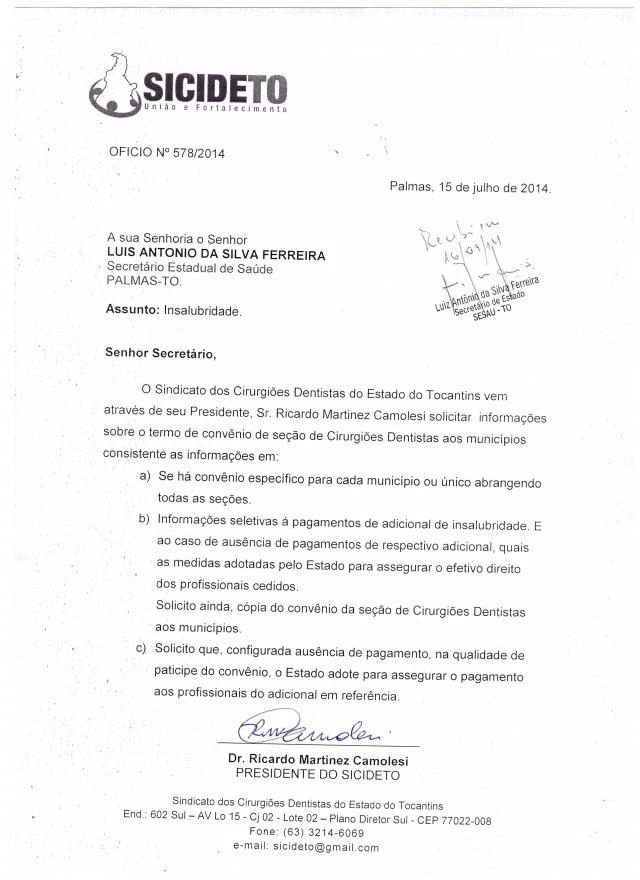 O Sindicato dos Cirurgiões Dentistas do Estado do Tocantins vem através de seu Presidente, Sr. Ricardo Martinez Camolesi solicitar informações sobre o termo de convênio de seção de Cirurgiões Dentistas aos municípios consiste as informações em: