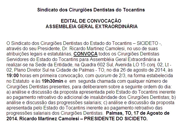 O Sindicato dos Cirurgiões Dentistas do Estado do Tocantins – SICIDETO -, através do seu Presidente, Dr. Ricardo Martinez Camolesi, no uso de suas atribuições legais e estatutárias, CONVOCA todos os Cirurgiões Dentistas Servidores do Estado do Tocantins para Assembléia Geral Extraordinária a realizar-se na Sede da Entidade, na Quadra 602 Sul, Avenida LO 15 conj. 02, Lt -02, Plano Diretor Sul na Cidade de Palmas - TO, no dia 26 de agosto de 2014, às 19:00 horas em primeira convocação, com quorum de 2/3, na forma estabelecida no Estatuto e às 19h30min e em segunda chamada com qualquer número de Cirurgiões Dentistas presentes, para deliberarem sobre a seguinte ordem do dia: a) análise e discussão da proposta apresentada pelo Estado do Tocantins inerente ao pagamento retroativo do adicional de insalubridade dos Cirurgiões Dentistas; b) análise e discussão das progressões salariais; c) análise e discussão da proposta apresentada pelo Estado do Tocantins inerente ao pagamento retroativo das progressões salariais dos Cirurgiões Dentistas. Palmas, TO, 17 de Agosto de 2014. Ricardo Martinez Camolesi – PRESIDENTE DO SICIDETO.